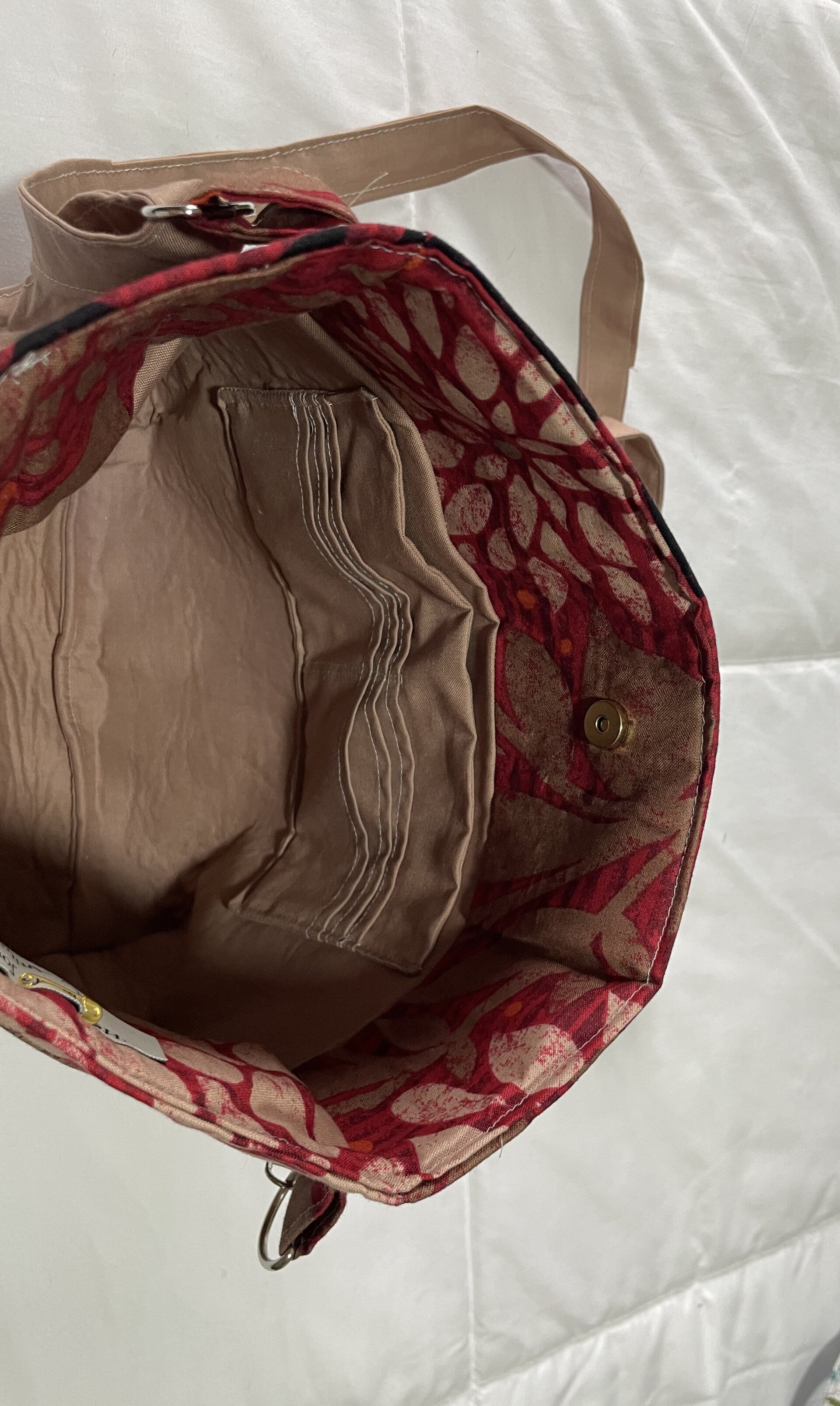Rustic red accents this one of a kind tote. Made from good quality cotton - and fully washable!